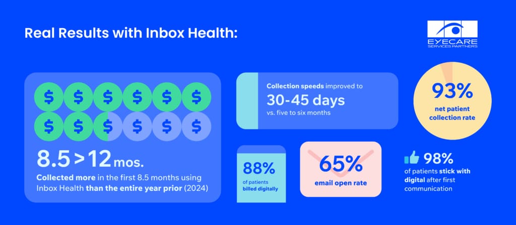 In 2025, Eyecare Services Partners adopted Inbox Health’s automated patient billing solution. The technology platform has been embraced by both staff and patients alike and quickly led to measurable results, including a boost in collection rates, faster payment speeds, improved staff efficiency, and improved patient satisfaction.